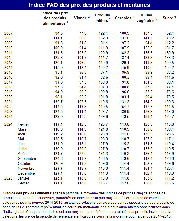 L’indice FAO des prix des produits alimentaires a affiché une valeur moyenne de 127,1 points en février 2025, soit une hausse de 2,0 points (1,6 pour cent) par rapport à sa valeur révisée de janvier. L’indice des prix de la viande est resté stable, mais tous les autres indices des prix ont progressé, les augmentations les plus significatives ayant été enregistrées pour le sucre, les produits laitiers et les huiles végétales. L’indice global a gagné 9,7 points (8,2 pour cent) par rapport à sa valeur constatée un an auparavant, mais était toutefois encore en recul de 33,1 points (20,7 pour cent) par rapport à son niveau record de mars 2022.